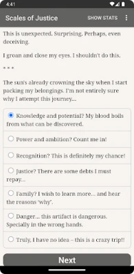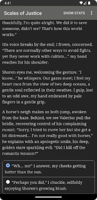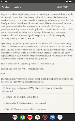 "Scales of Justice" is a 600,000-word interactive novel, the first volume in a planned series by Julia Owl. It's entirely text-based–without graphics or sound effects–and fueled by the vast, unstoppable power of your imagination.
