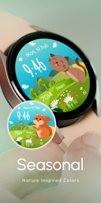Wear OS Watch Face with spring and summer heralding animals 🐰 Bunny, 🐤 Chick, 🐑 Lamb, 🦊 Fox, 🐶 Dog, 🐱 Cat, 🐻 Bear, 🐿️ Squirrel, 🦌 Deer, set against a splendid mountainous nature landscape 🌄🌿. Perfect for seasons like spring and summer.